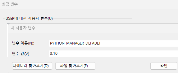 환경 변수 - 사용자 변수에 PYTHON_MANAGER_DEFAULT라는 변수를 생성 후, 값을 원하는 버전으로 설정