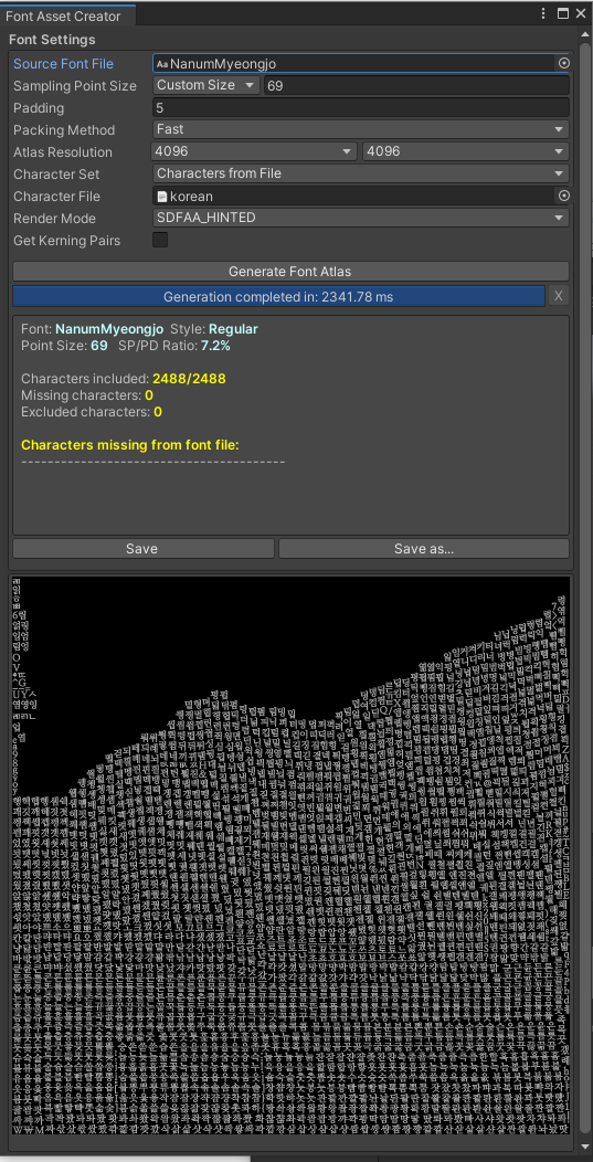 * Missing Characters가 많다면 Atlas Size가 충분하지 않은 것이므로 늘리면 된다.