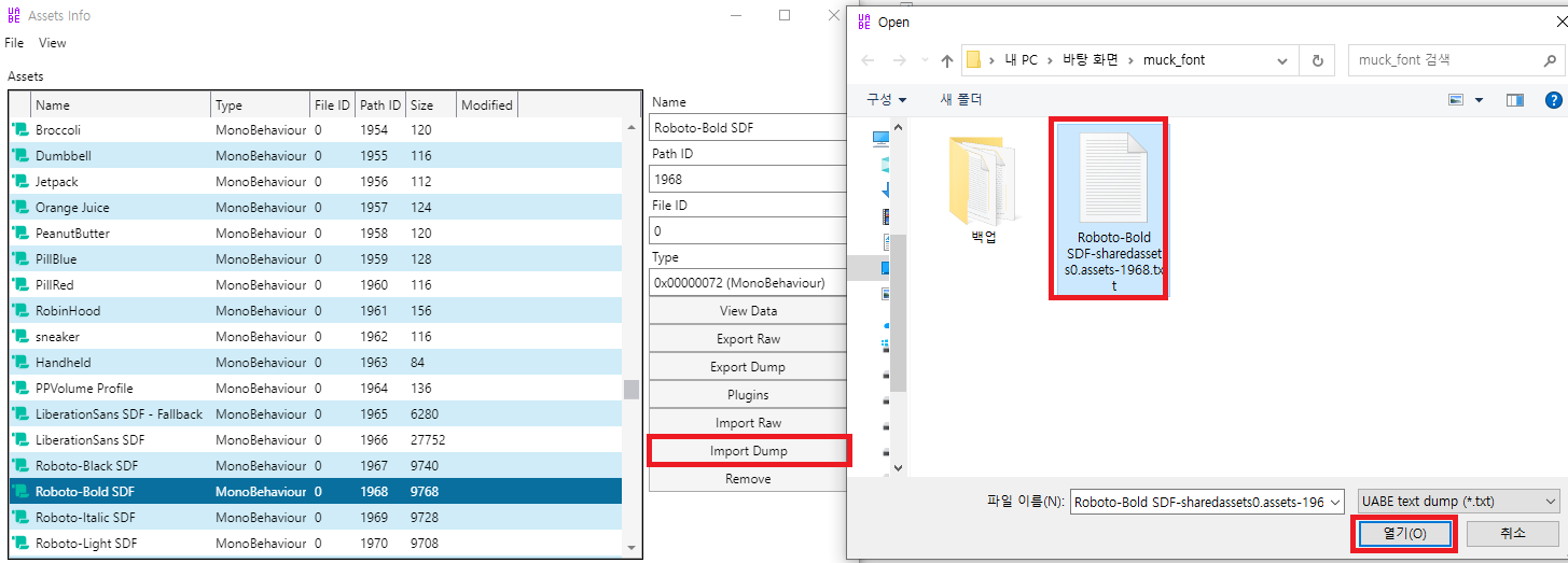 제작한 폰트의 좌표파일 m_PathID, m_FileID를 검색해서 수치를 원본과 동일하게 바꿔준다.
