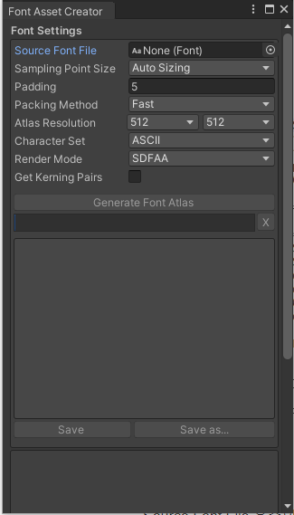 Generate Font Atlas를 누르면 위와 같이 만들어진 폰트 미리보기가 나오고,