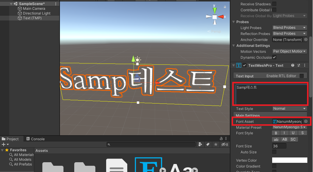유니티 창의 우측 부분을 보면 <TextMeshPro - Text> 파트가 있다.
