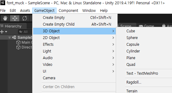 Game Object -> Text - TextMeshPro를 누른 후,