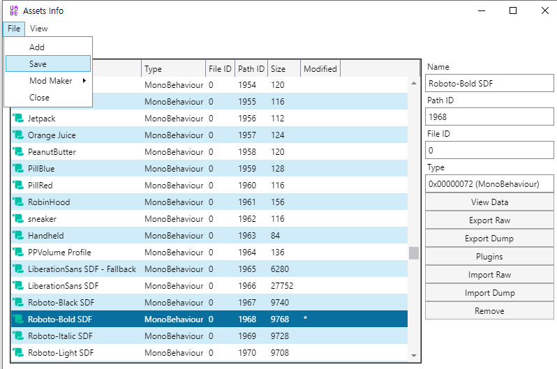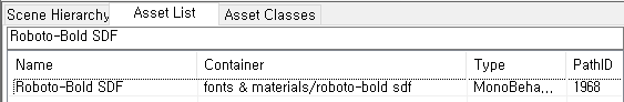 이후, View - Go to asset - Path ID 1968 - 확인을 눌러 이동해주면 Roboto-SDF MonoBehaviour 파일이 선택된다.