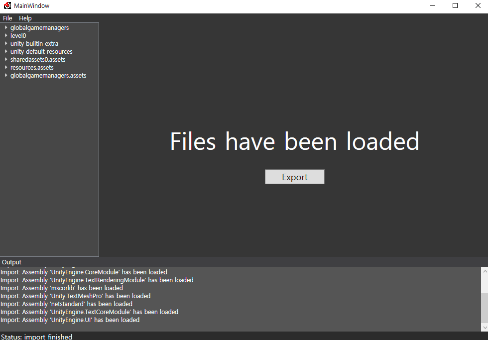 게임폴더를 드래그하면 파일이 로드되고, export를 하면 에셋이 UnityProject에서 사용 가능한 형태로 export된다.