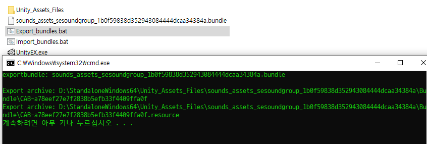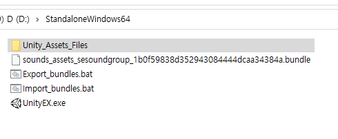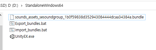 1. 다운받은 UnityEX.exe 파일과 bat파일들, 풀고자 하는 번들 파일을 같은 폴더에 놓는다.