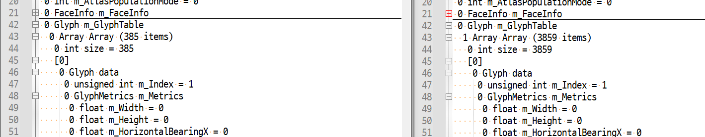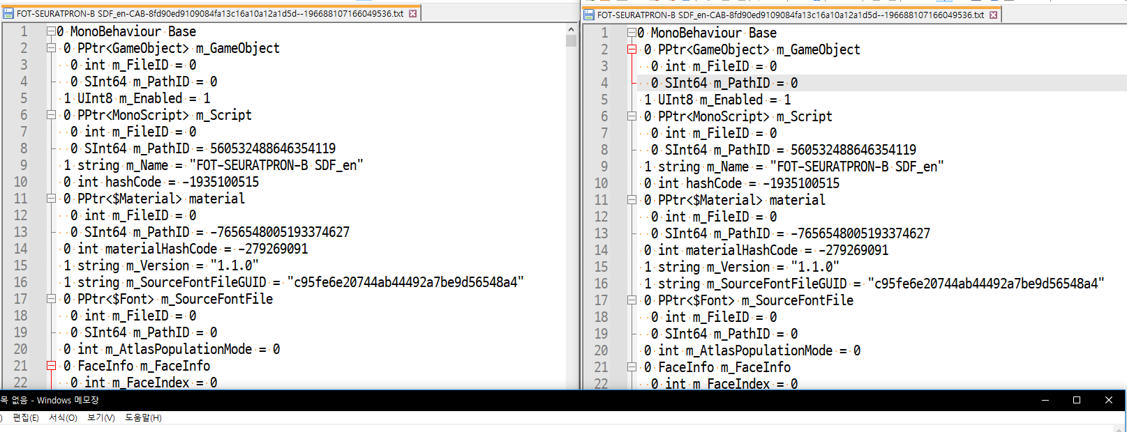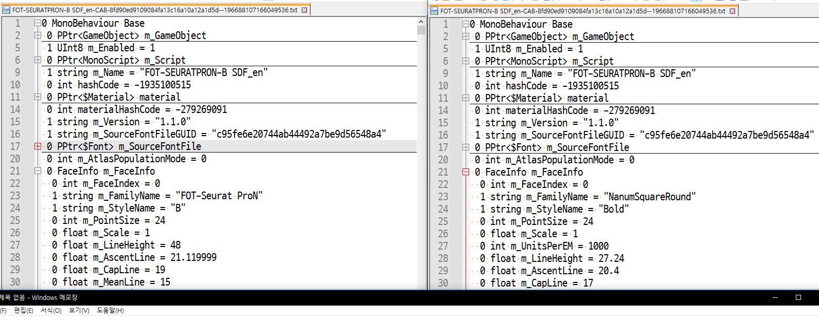 위 스샷 기준으로 보자면 m_FaceIndex부분이 양쪽에 동일하게 있으니 0 PPtr<$Font> m_SourceFontFile 부분까진 모두 접어버리면 된다.