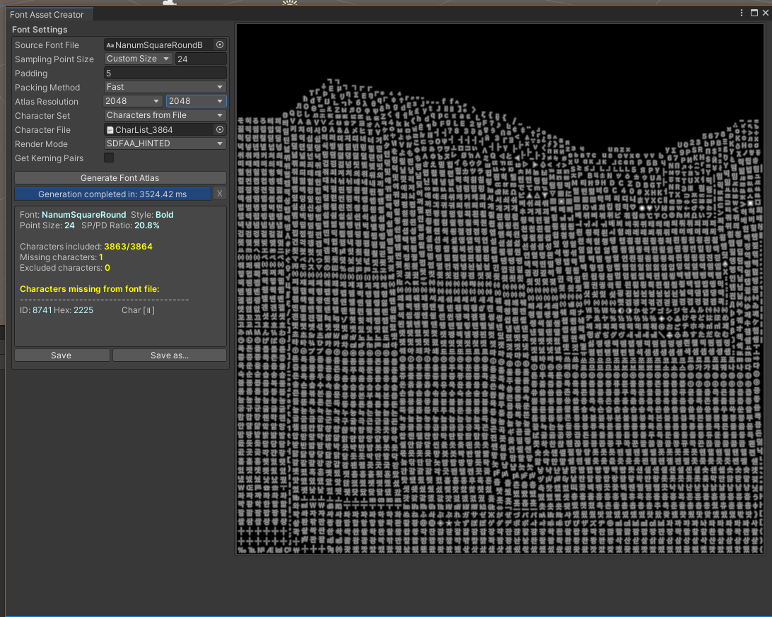 내가 사용하는 문자 세트는 3864글자나 되기 때문에, 2048x2048로 제작하였다.