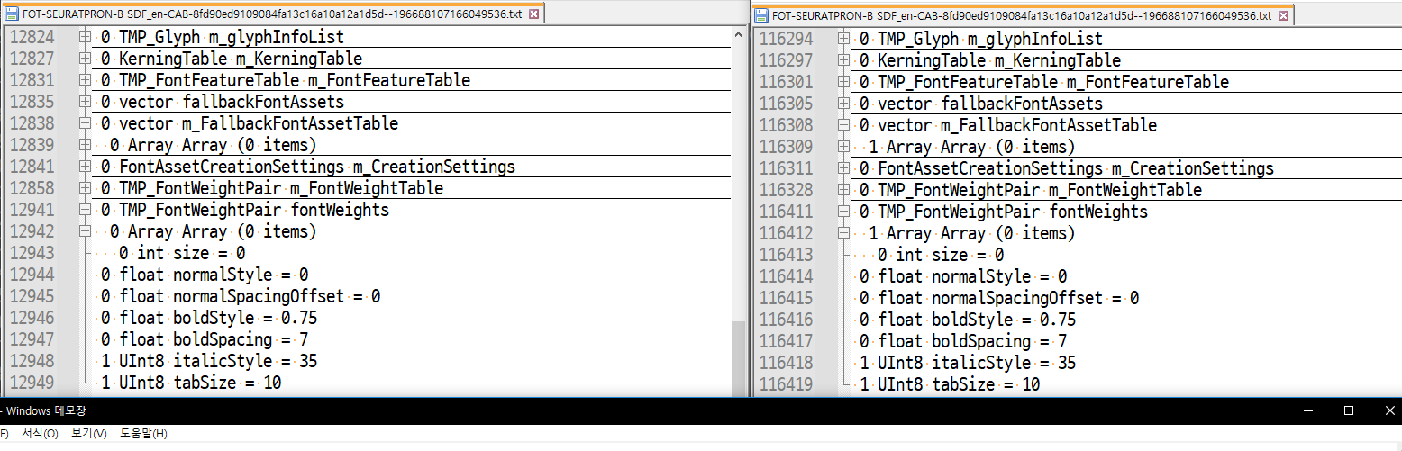 우선, Notepad++를 이용해 왼쪽에 원본 폰트의 Monobehaviour dump를, 오른쪽엔 내가 작업한 폰트의 Monobehaviour dump를 열어둔 후,