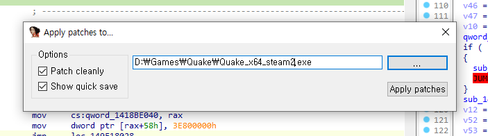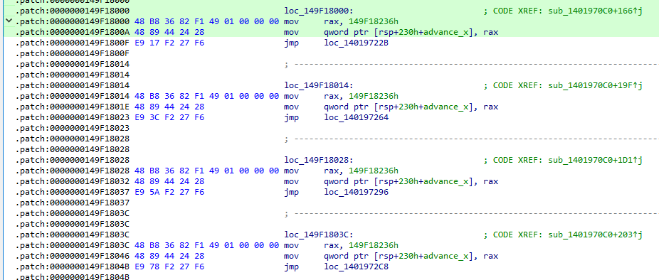 mov qword ptr [rsp+230h+advance_x], r14 형태의 5바이트 바이트코드를 jmp {코드케이브 주소}로 대체 (같은 5바이트)