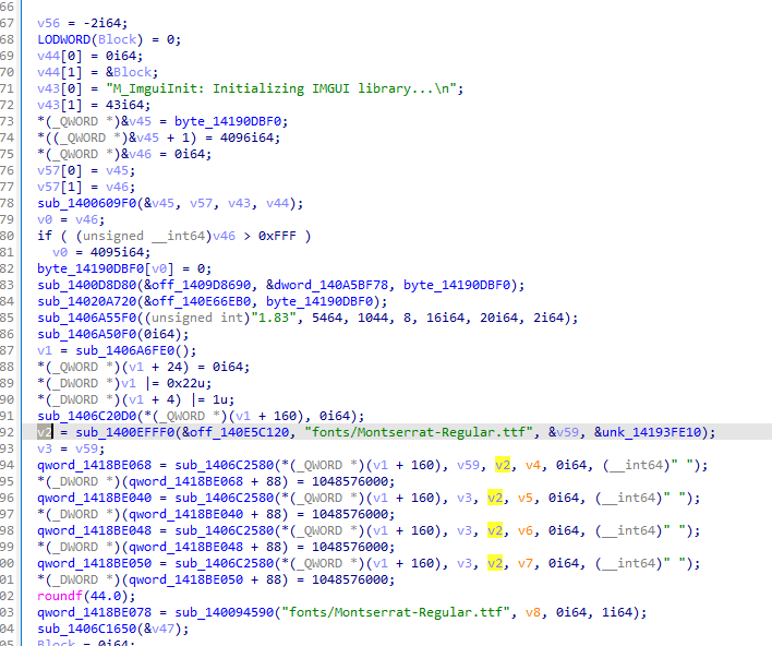 여러가지 동적 분석, 정적 분석을 통해 sub_1401970C0 함수가 ImGUI 초기화 및 메인메뉴의 폰트 아틀라스를 구성하는 ImGUI의 함수란걸 알았습니다.