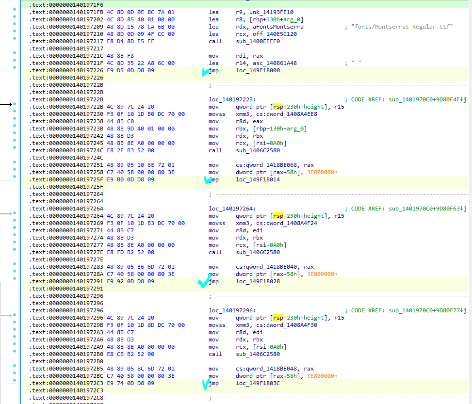 이제 mov qword ptr [rsp+230h+advance_x], r14 형태로 전달되는 글리프 범위 (6번 인자)를